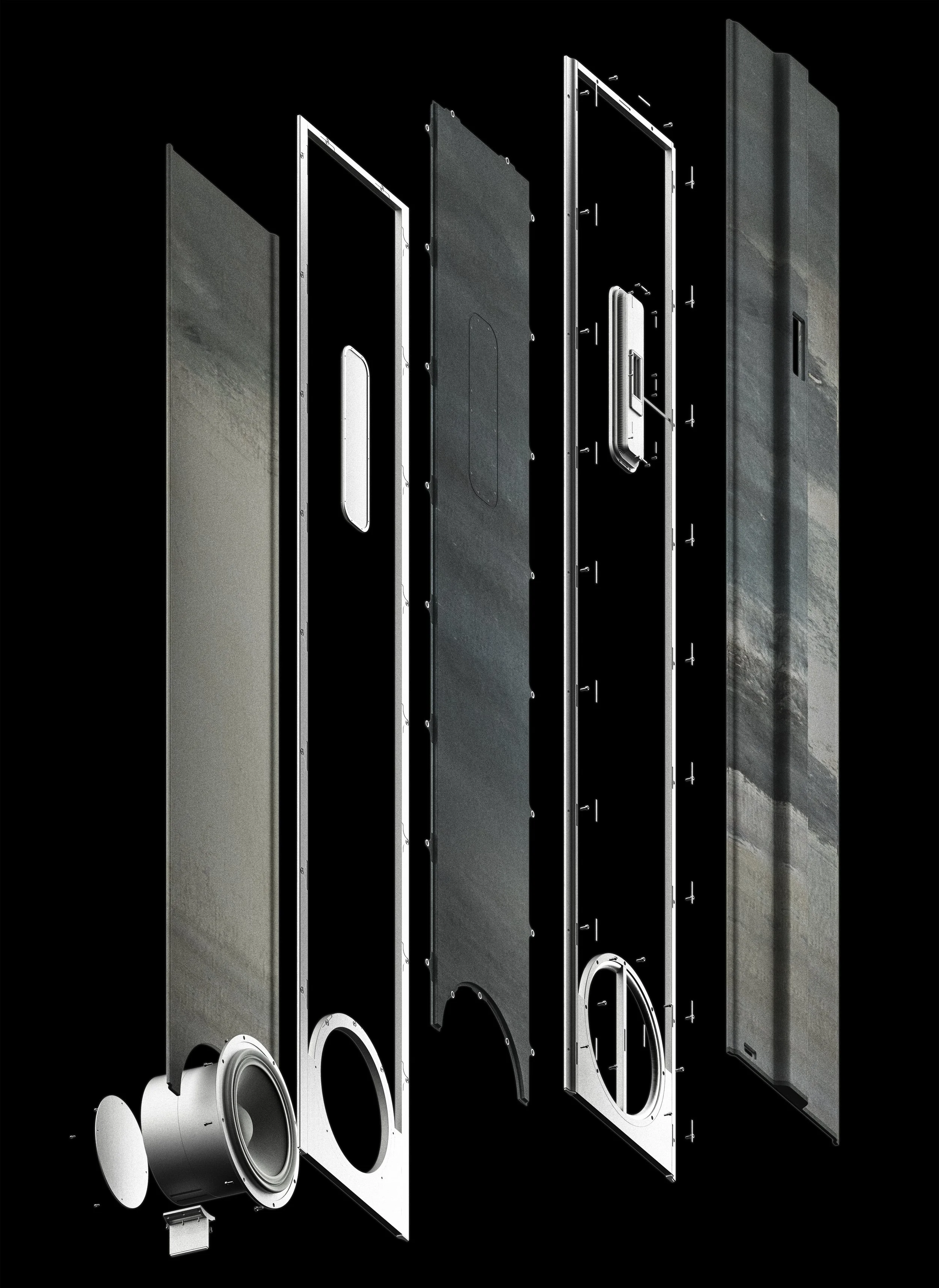 DML’s (or distributed mode loudspeakers) attach a magnet motor directly onto an ultra-light panel substrate instead of a conventional cone, vibrating it to produce sound . With such a radical increase in effective cone area, they produce an unusually diffuse sound field, often described as extending beyond the boundaries of the room. Having built a few of my own back in college, I was always struck by how enveloping the sound-stage was from a pair of seemingly innocuous planes of treated polymer foam. The unda DML is my take on a commercialized design, to be either mounted in-wall or placed freestanding, the canvas panel used as a customizable graphic display.